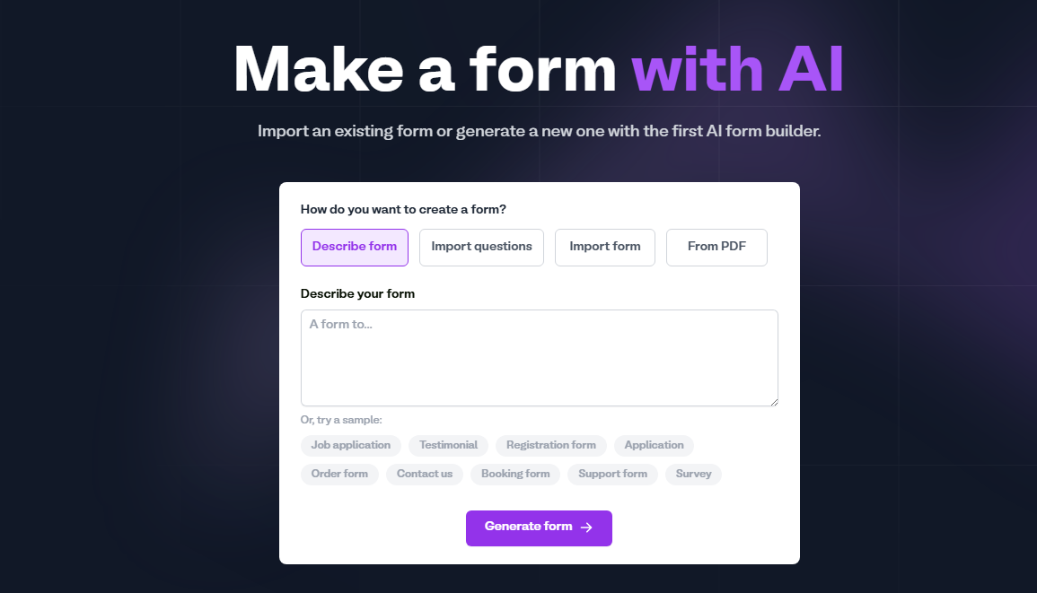- AI form generation with multiple inputs: Generate forms from a simple text description, documents, PDFs, or Google Docs. The AI can also create forms in multiple languages.