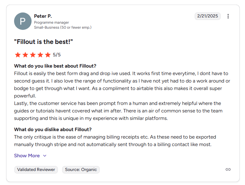 Pro: “Fillout is easily the best form drag and drop I've used. It works every time, I don't have to second-guess it. I also love the range of functionality as I have not yet had to do a workaround or bodge to get through what I want.” — G2