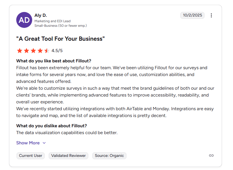 Alt text: G2 review of Fillout, highlighting ease of use and integrations.