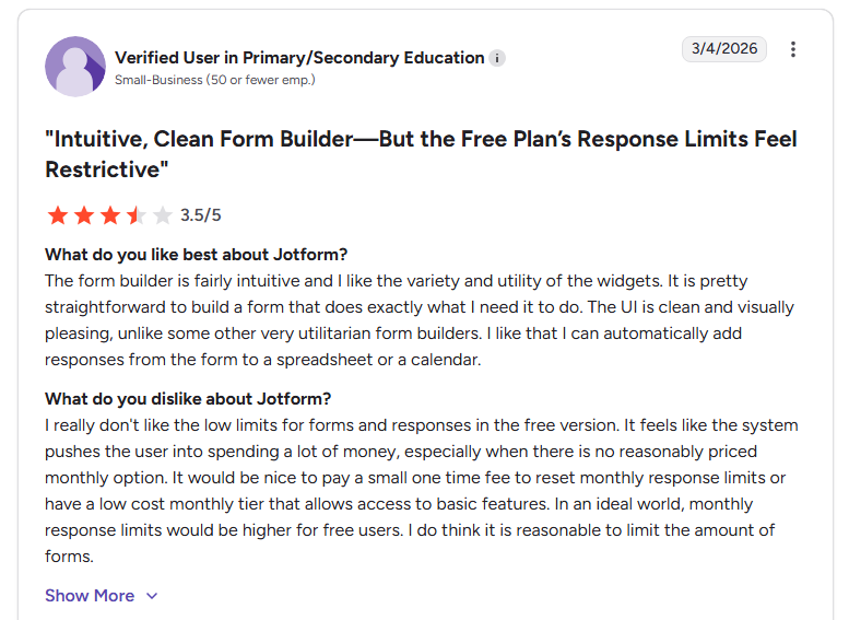 Con: "I really don't like the low limits for forms and responses in the free version. It feels like the system pushes the user into spending a lot of money, especially when there is no reasonably priced monthly option." — G2