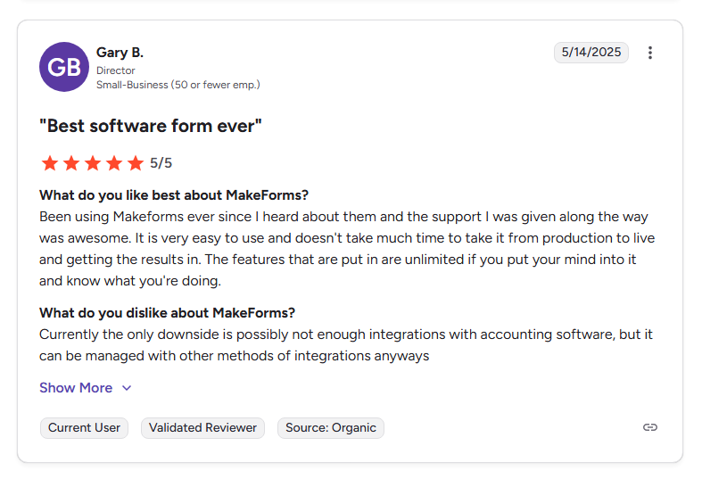 Con: "I’d love to see even more customization options for form design and branding." — G2