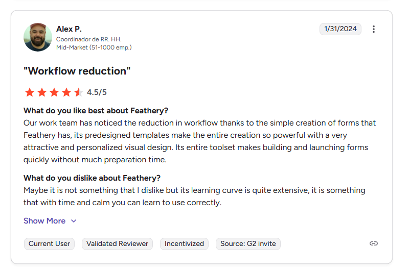 Alt: G2 review of Feathery praising its workflow automation and templates while noting a steep learning curve
