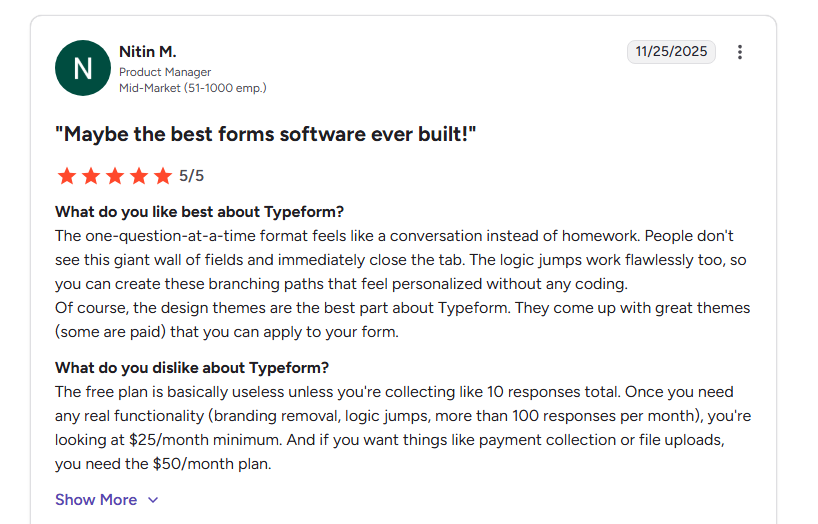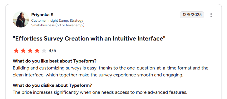 Alt: G2 review of Typeform praising its intuitive one-question-at-a-time interface while noting that pricing increases for advanced features.