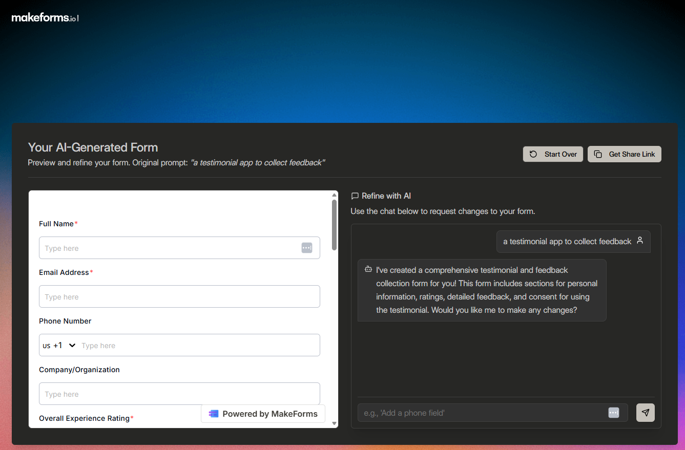 Alt: MakeForms AI form builder, generating a form from a text prompt