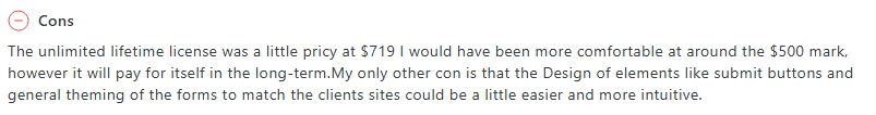 Alt: User review highlighting concerns about Fluent form’s pricing and suggesting the form design interface could be more intuitive.