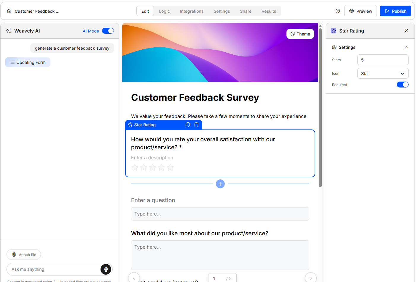 Weavely’s form builder generates ready-to-use forms. I liked that I could make changes with follow-up prompts, especially since using its visual editor can feel tedious.