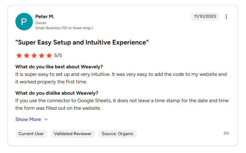 Alt: User review for Weavely, noting limited customization options for form design and branding