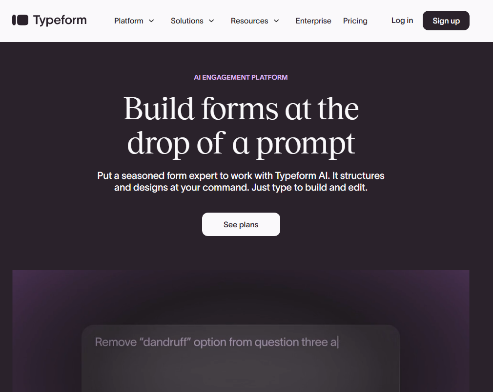 What it does: Typeform is a form builder that presents one question at a time, creating a conversational flow that keeps respondents engaged through to the end.
