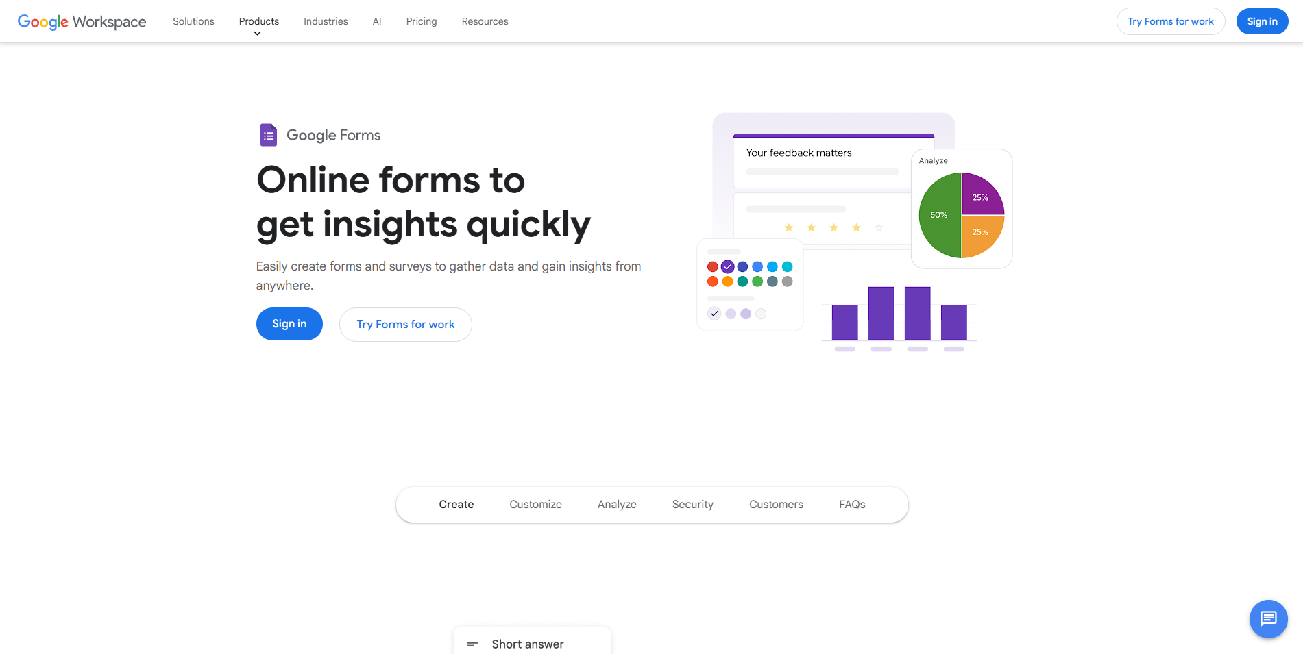What it does: Google Forms is a free form builder for creating surveys, quizzes, and data collection forms that sync responses directly to Google Sheets.