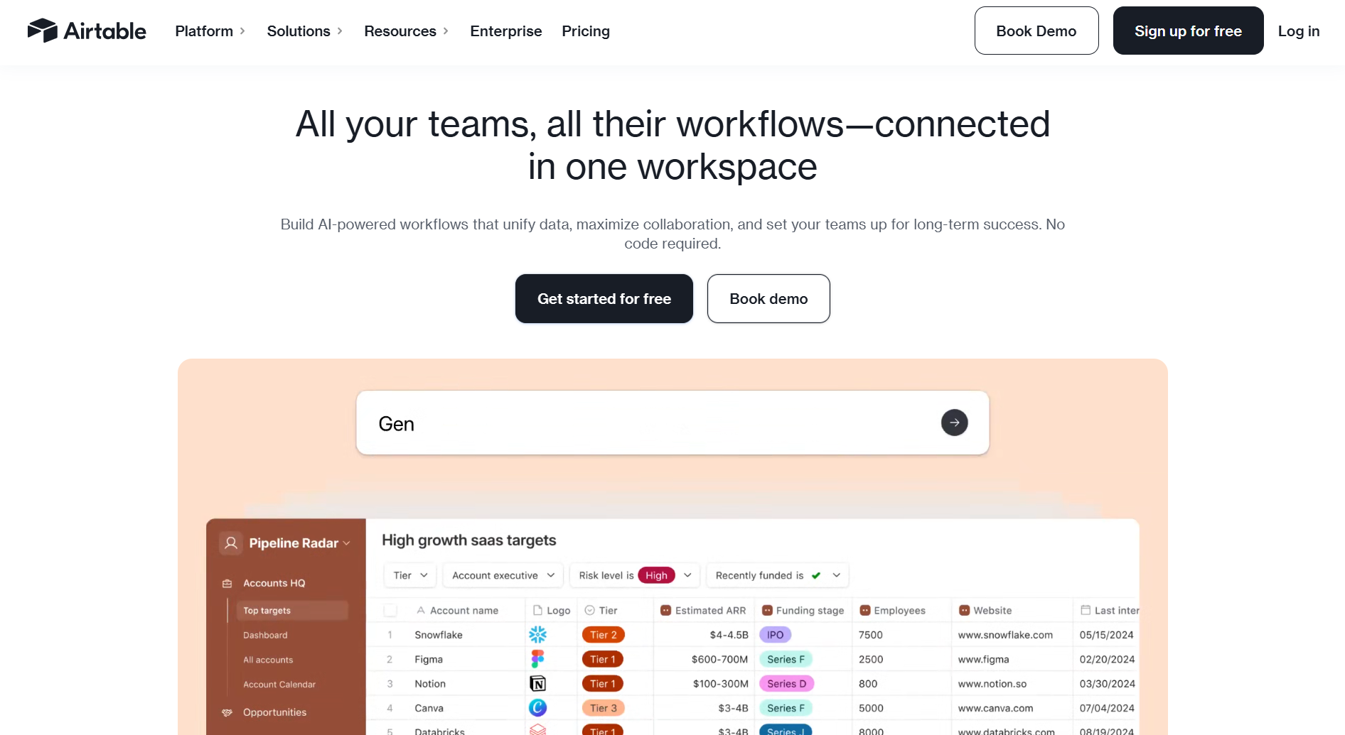 - What it does: Airtable combines spreadsheet interfaces with a built-in database and AI agents for automating tasks, all without code, using conversational prompts.