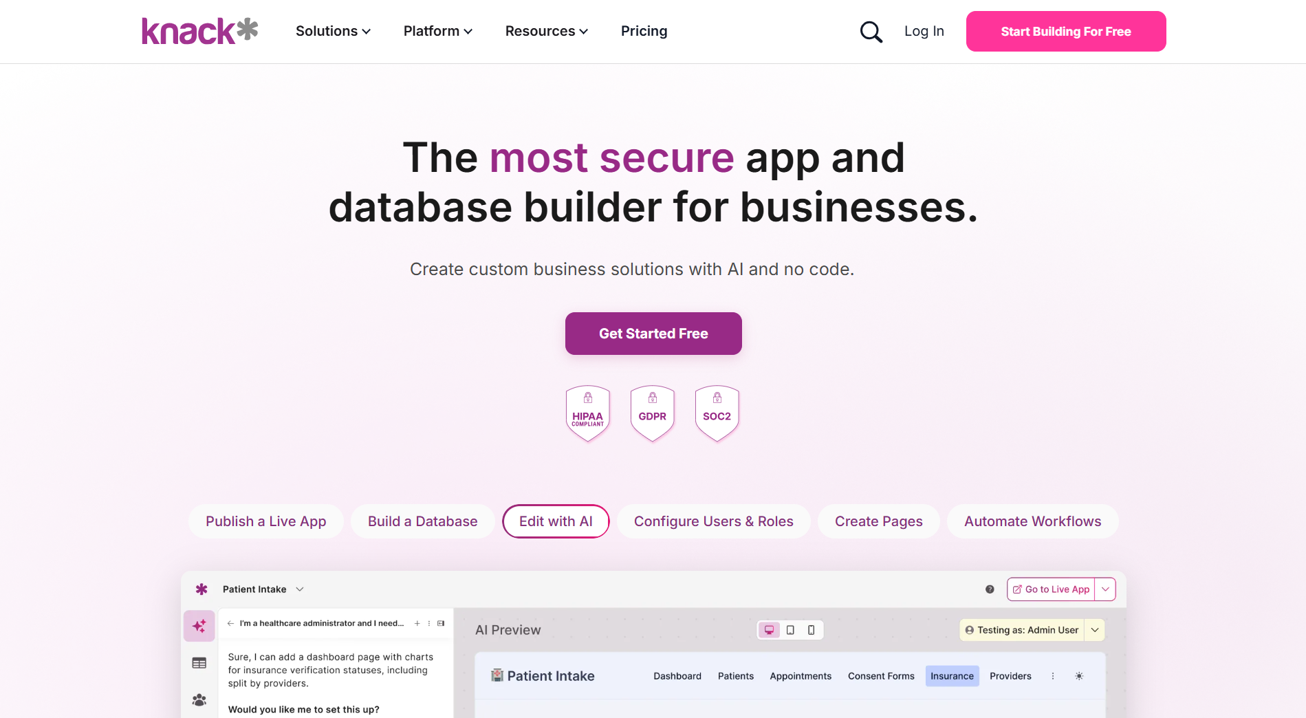 - What it does: Knack is a no-code database and app builder that creates relational database applications with custom interfaces, workflows, and user portals from conversational prompts.