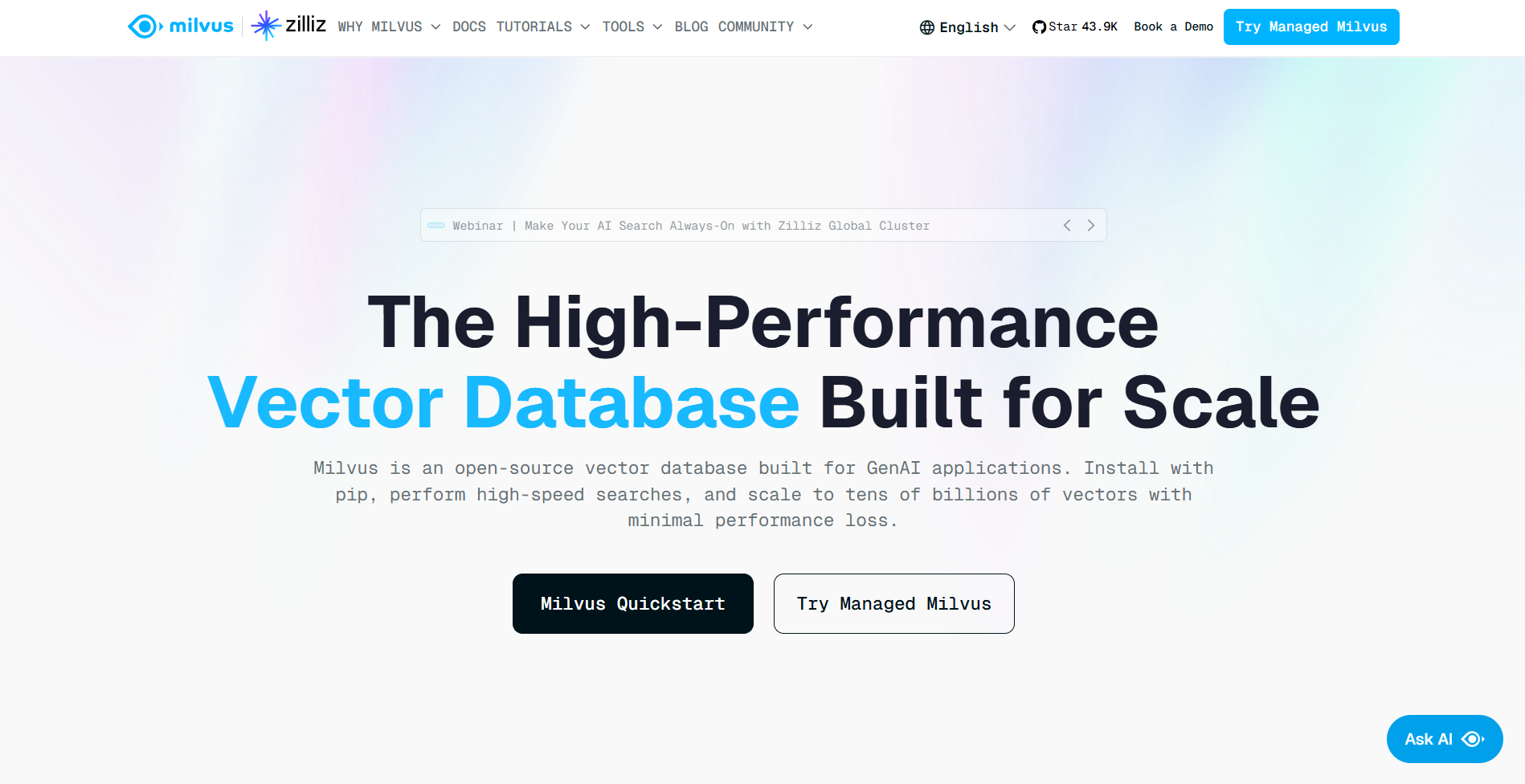 - What it does: Milvus is an open-source vector database. It searches billions of vectors fast using distributed systems and GPU power.