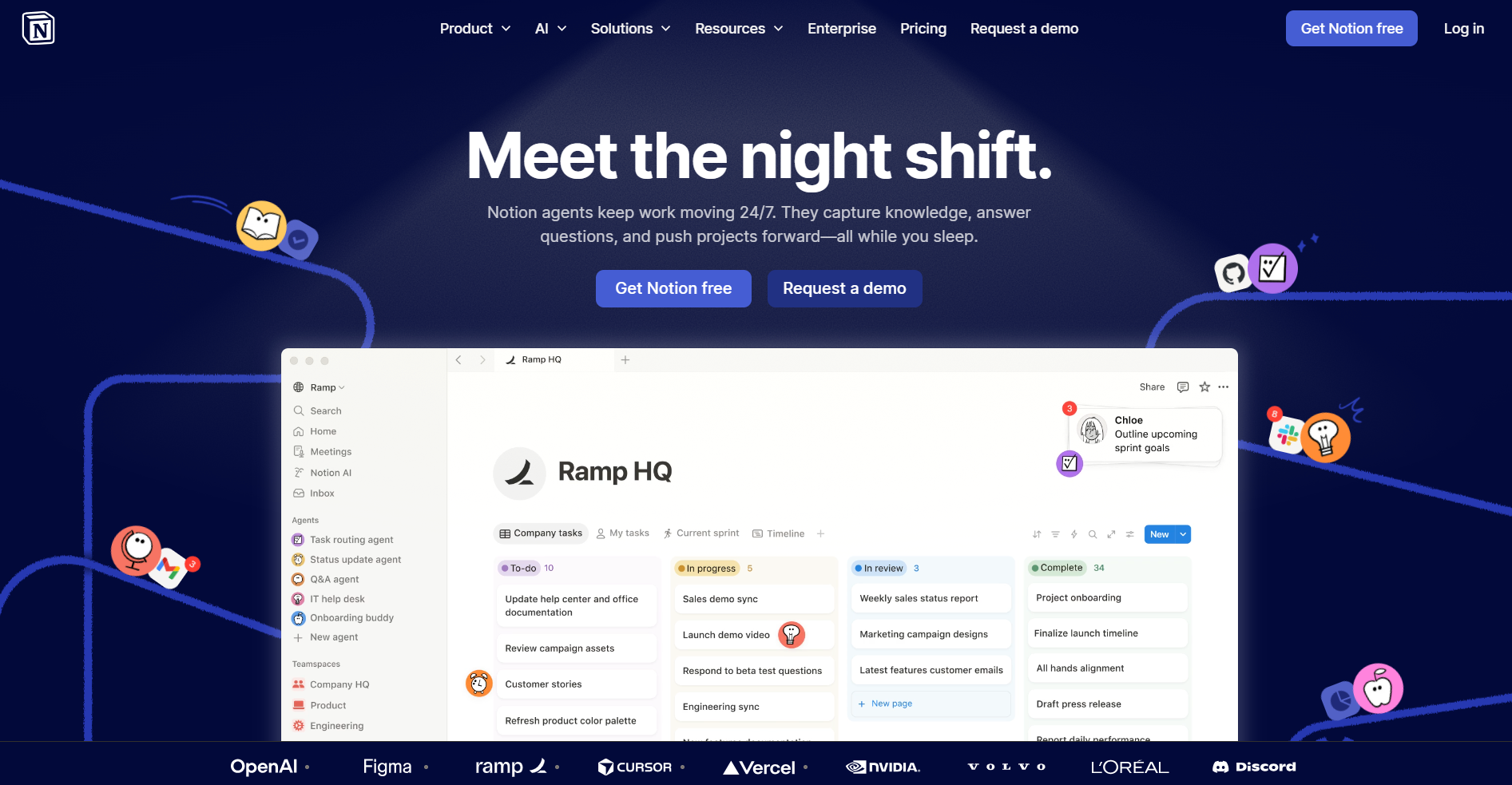 - What it does: Notion combines documents, wikis, databases, and task management in one workspace with flexible views, templates, and AI agents for writing and automation.