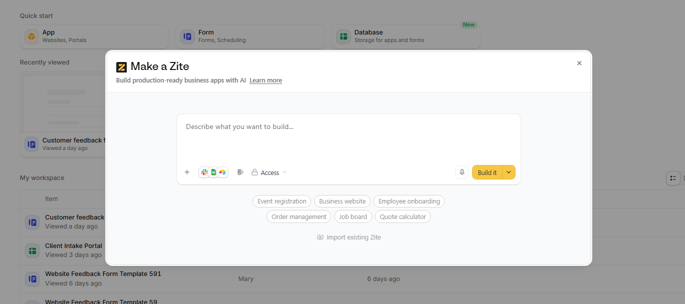 - Built-in database included: Zite automatically creates the tables your app needs based on your description. There’s no need to configure a separate database or write queries.