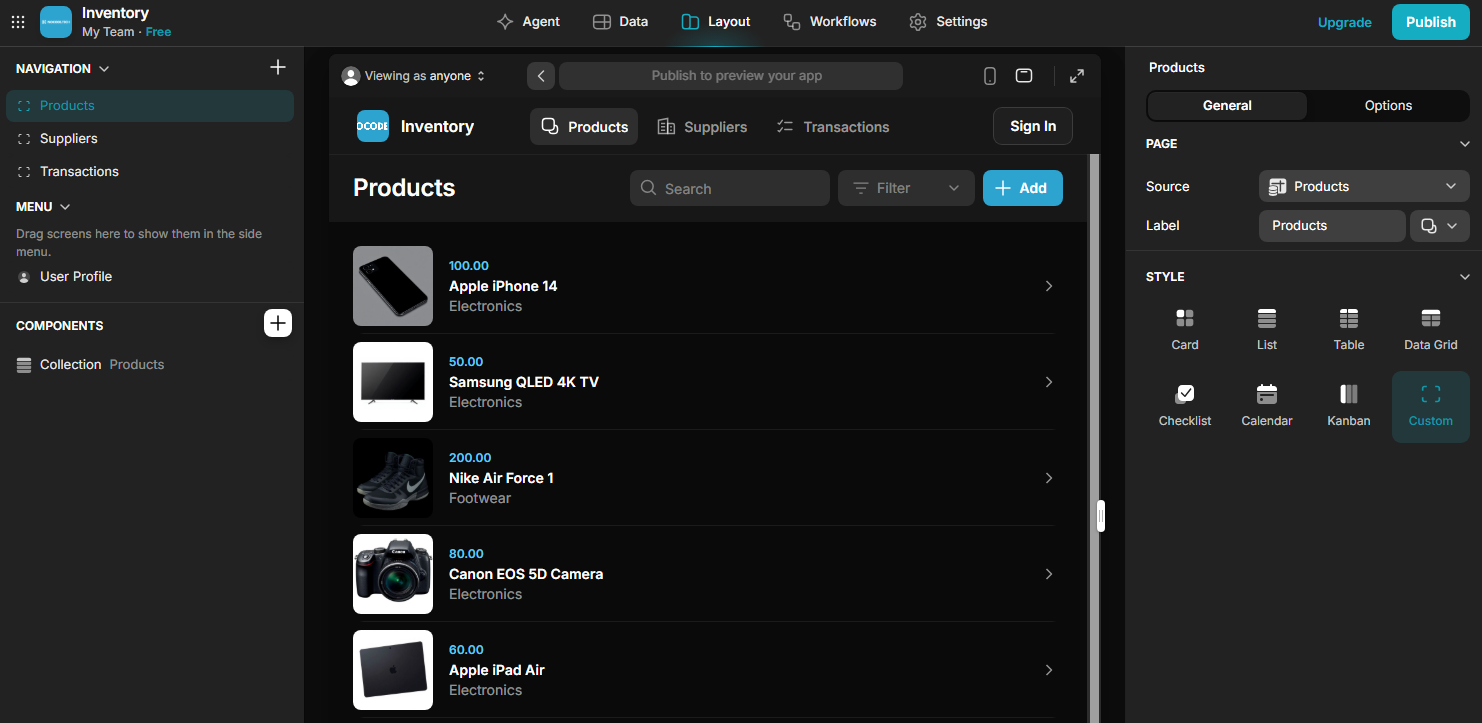 I connected a Google Sheet with inventory data, and Glide generated a usable app with lists, detail pages, and forms in under 10 minutes. Where Glide struggles is anything beyond basic data actions like viewing, adding, editing, and deleting records. If your app needs complex workflows or custom logic, you’ll likely hit limits.