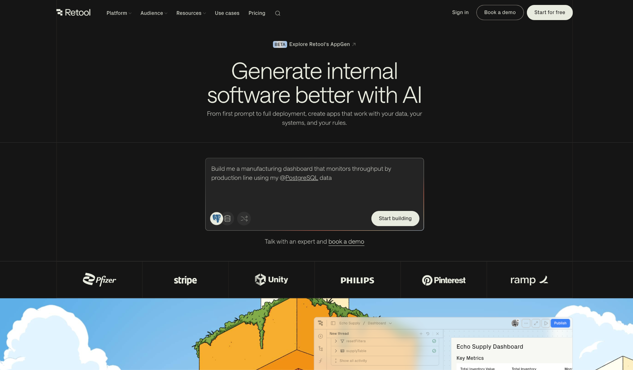 What it does: Retool lets engineering teams build internal admin panels, dashboards, and automations on top of their existing databases and APIs. It is built for business operations, not consumer-facing or mobile apps.