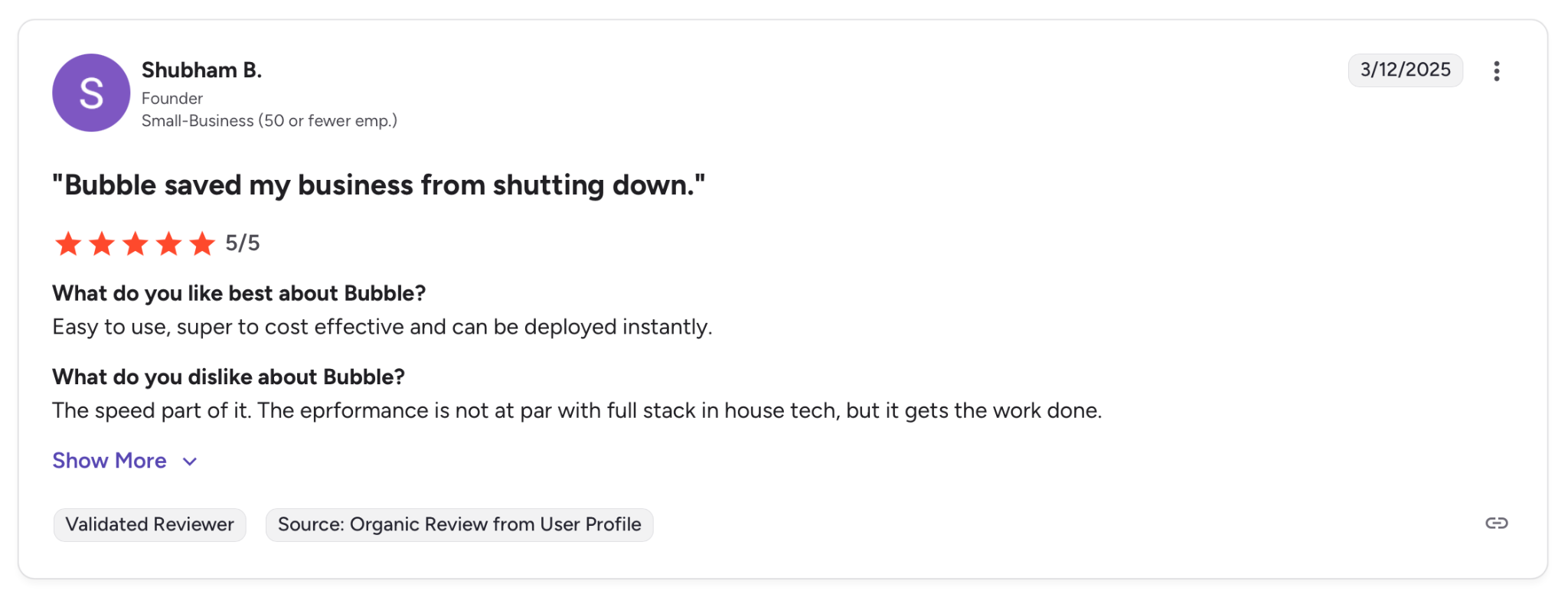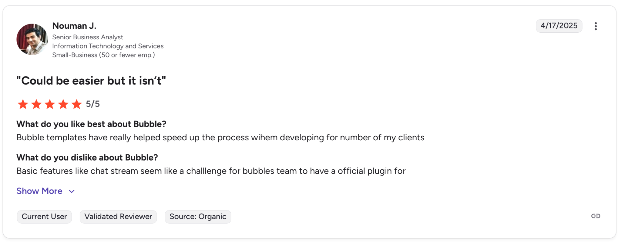 "Bubble templates have really helped speed up the process when developing for a number of my clients." — Nouman J. G2