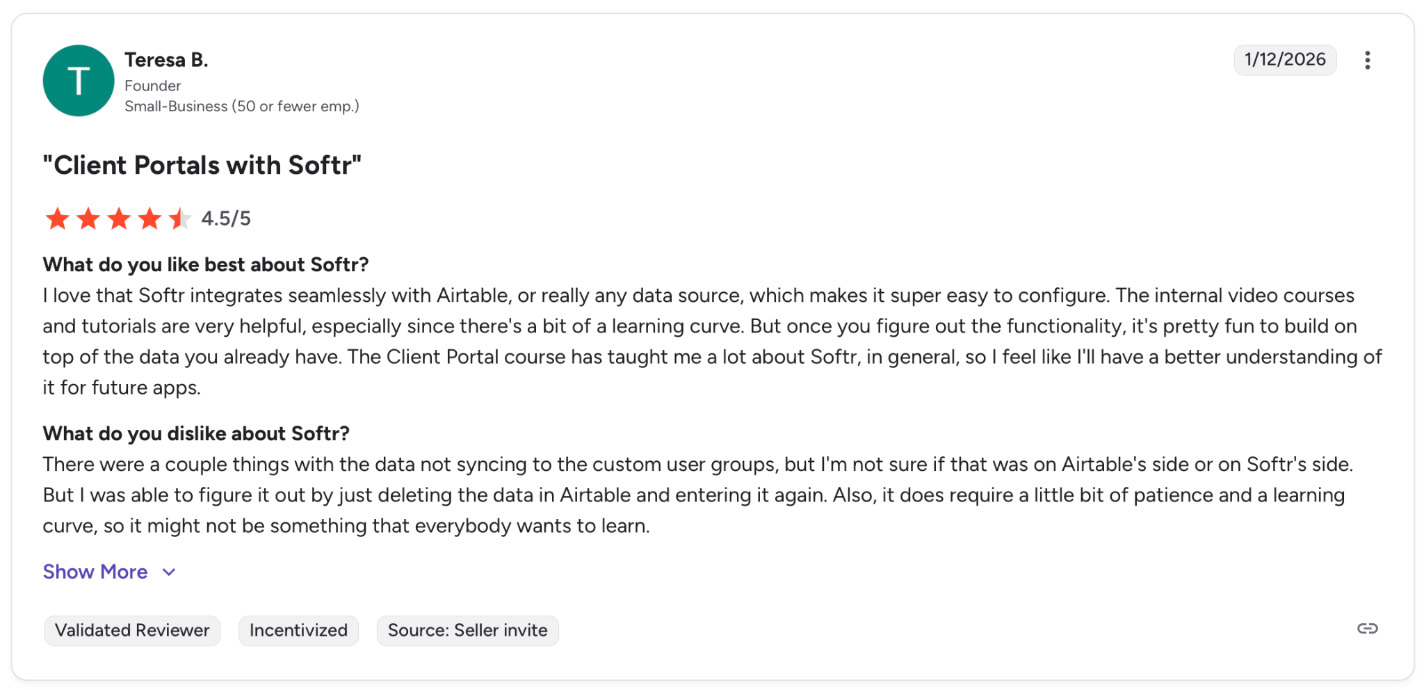 "There were a couple things with the data not syncing to the custom user groups, but I'm not sure if that was on Airtable's side or on Softr's side." — Teresa B. G2