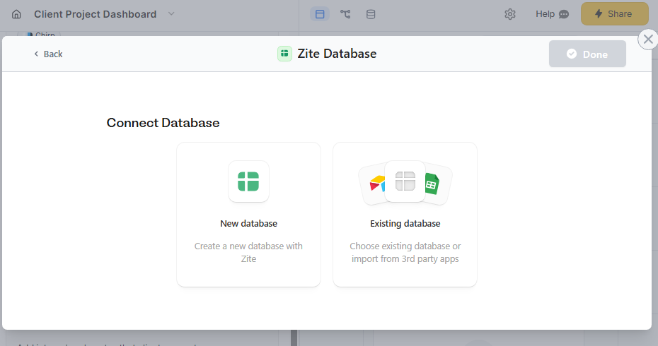 - Connect an existing database: If you already have project data elsewhere, you can connect to external sources. Zite supports native integrations with tools like Airtable or Google Sheets for data.