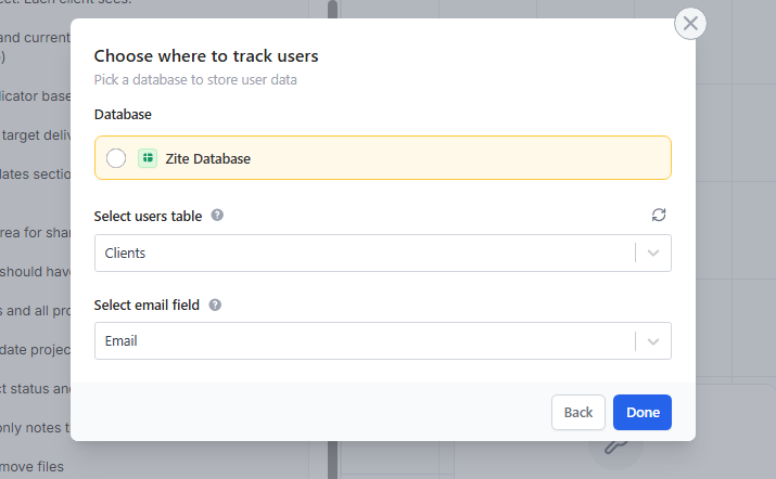 - Choose your user database: Since we’re using the built-in database, pick Zite Database and use the Clients table.