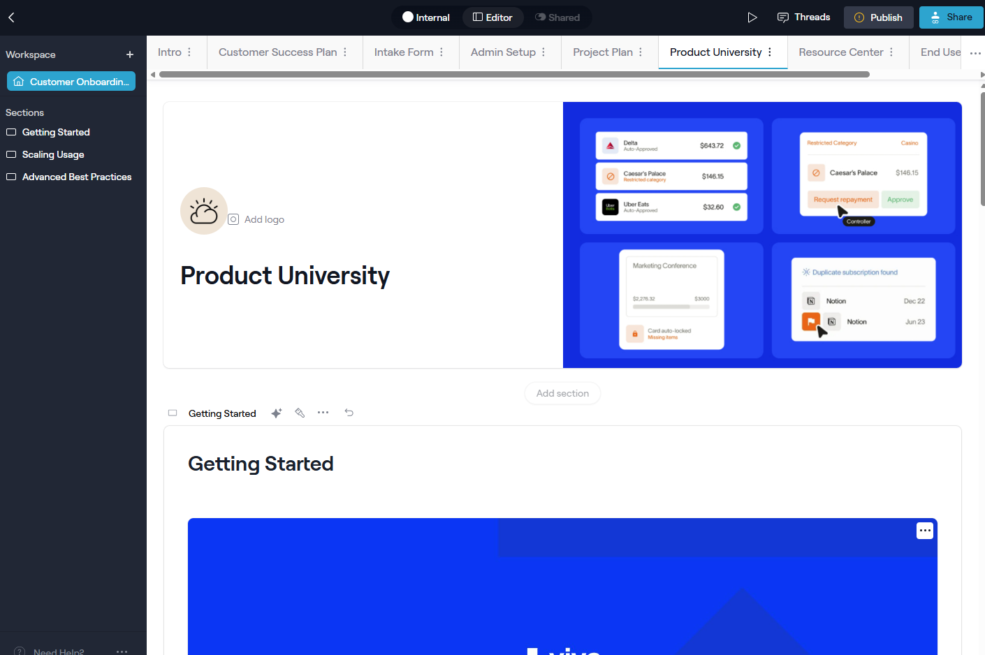 - Templated success plans: Use the onboarding templates to get started quickly. Project plans contain tasks with due dates, descriptions, and attachments. You can mark the task as internal or not.