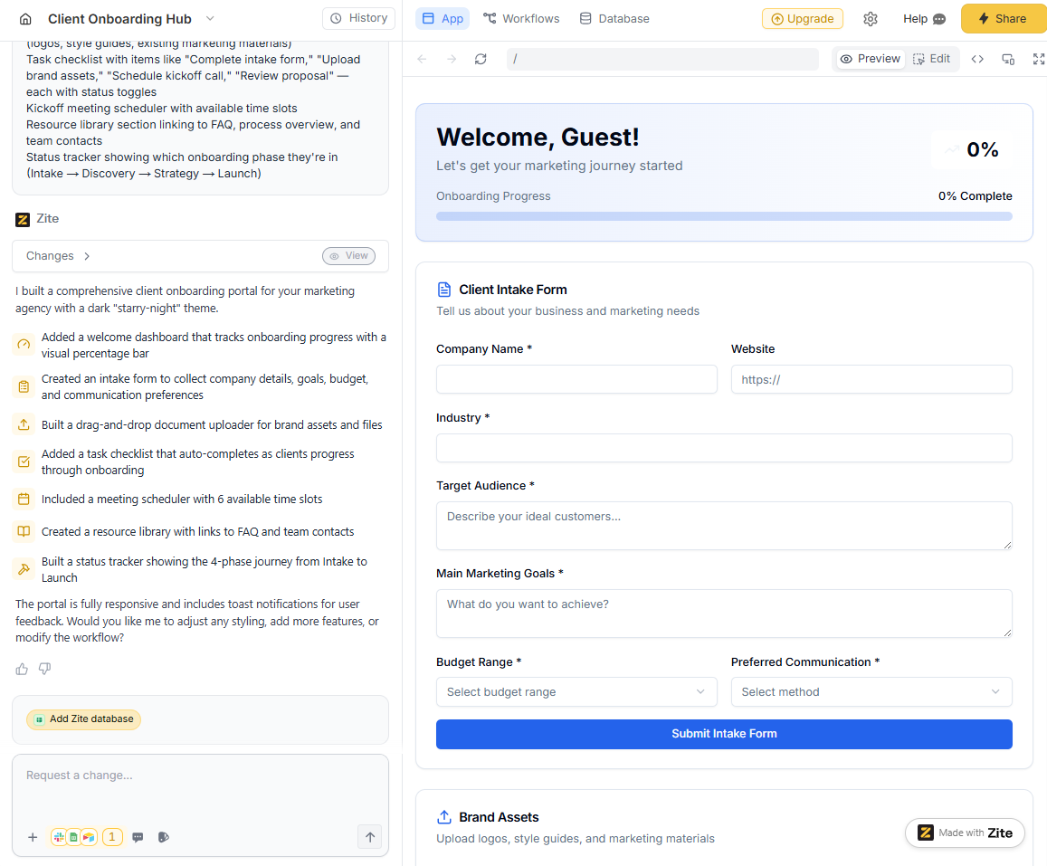 I tested Zite by describing the client onboarding portal I wanted. The AI generated a full-featured portal in under five minutes, including functionality I hadn’t thought of, like a drag-and-drop document uploader. It instantly created a client intake form, a task list with progress tracking, a document upload area, and a resource library of FAQs.