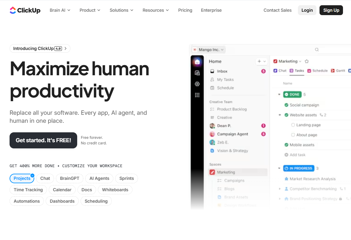 What it does: ClickUp combines project management, docs, wikis, chat, and dashboards in one platform. You can manage entire client onboarding workflows without switching tools.