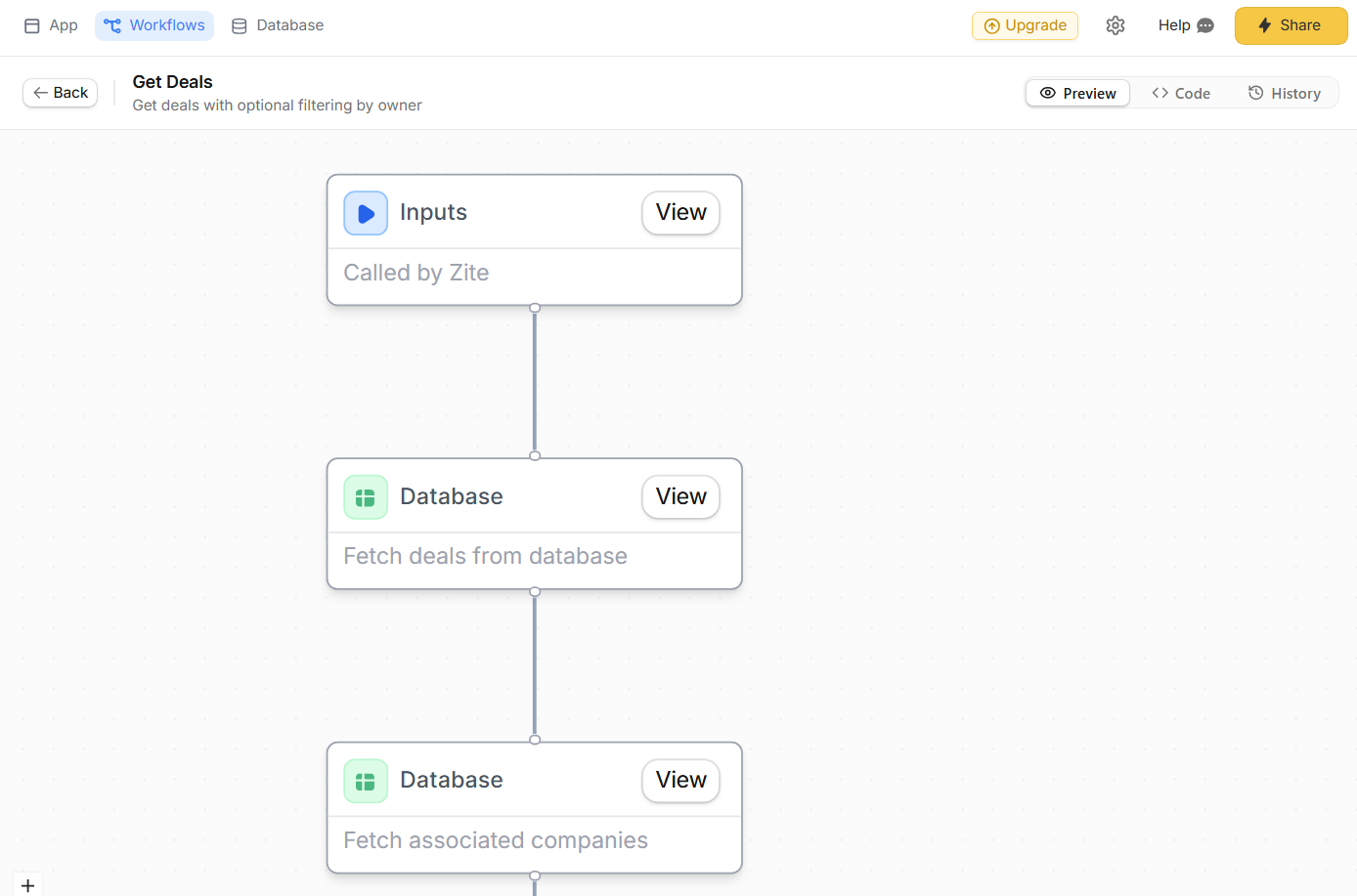 To start, open the Workflows tab to inspect the workflows Zite generated, and review past runs to understand how data moves through the pipeline. This lets you verify the logic and troubleshoot issues without reading code.
