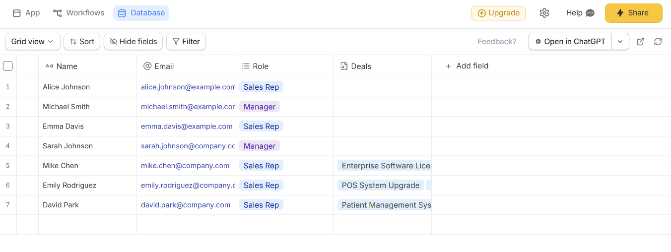 - New database: Zite instantly creates all necessary tables and fields based on your description. This is the easiest option for a new CRM. Zite auto-generates your data schema using its built-in database—no SQL required.