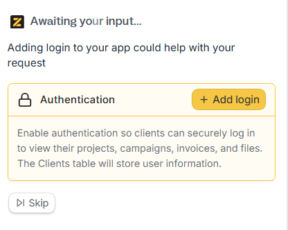 In the chat box, tell Zite to add authentication.