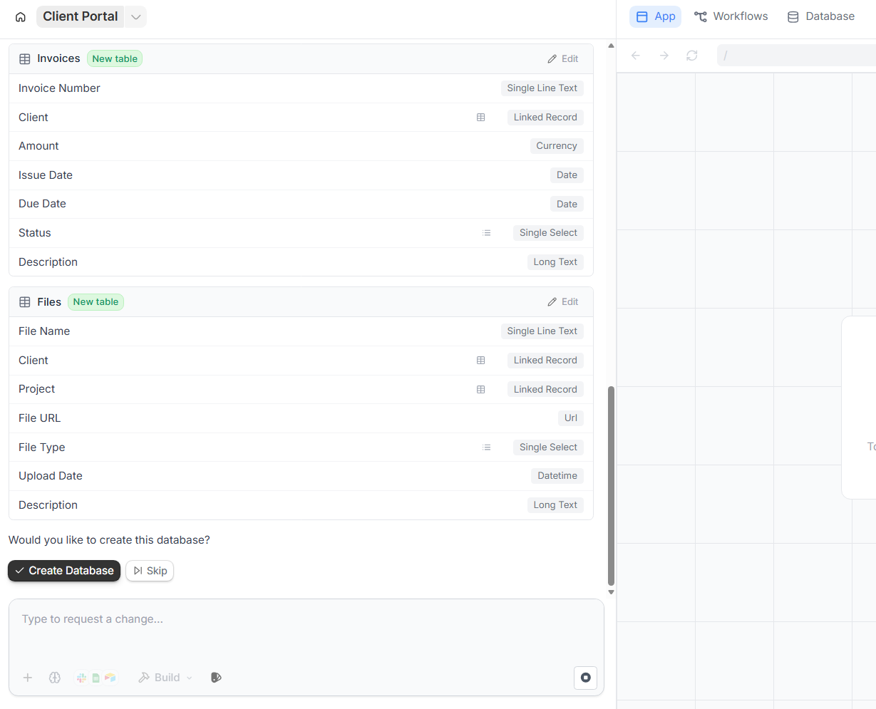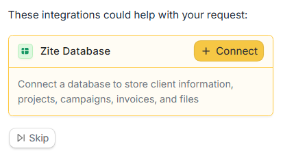 For most new portals, the built-in database is the simplest choice. Zite will automatically create the right tables and fields for your portal based on your description. You might see tables for clients, invoices, files, campaigns, and projects.