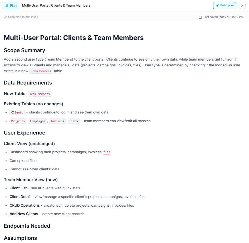 Before I added admin and client views, I switched to Zite’s Plan mode to think through what the app should look like. It asked a few clarifying questions, like who needs access and what each user type should see, then turned that into a build plan.