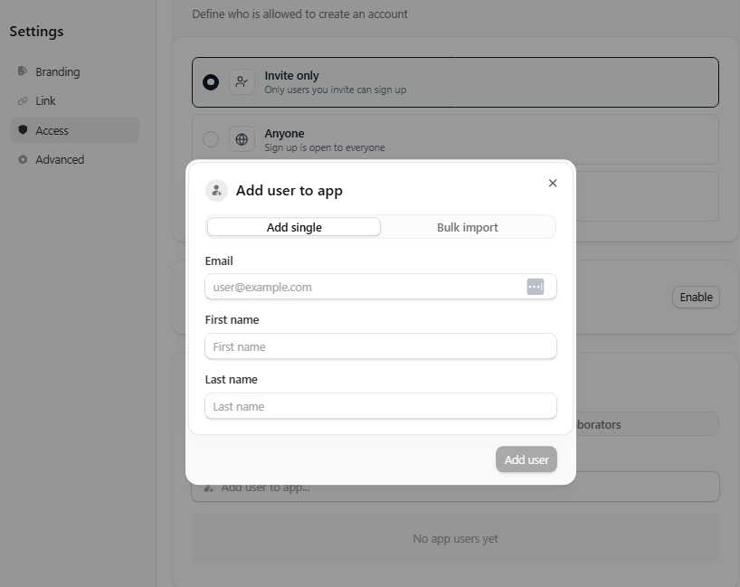 A client portal is the share to the web + invite only scenario because you want the app to be reachable from the internet, but only visible to clients you approve. After you publish, add your clients to the access list so they can sign in.