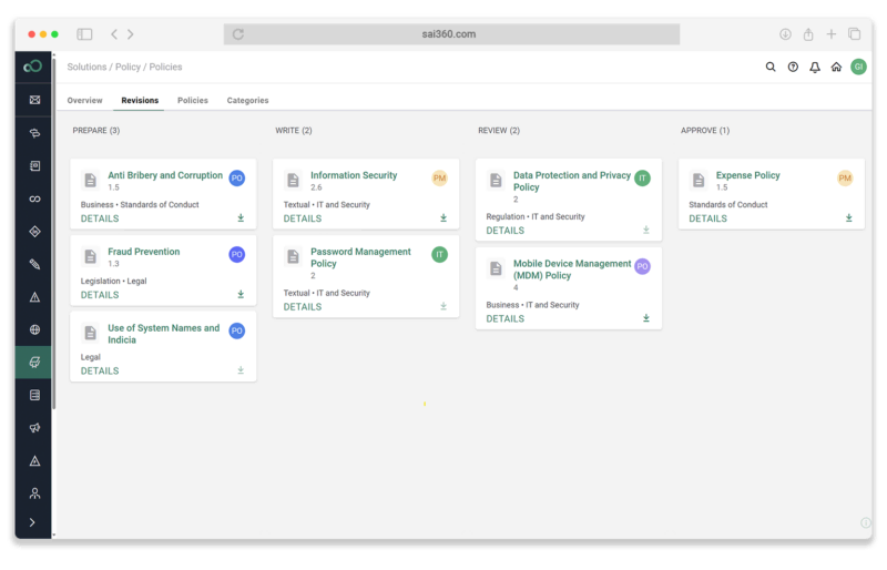 Vendors like SAI360 offer dedicated policy management software with employee-facing portals for policy access and attestations.