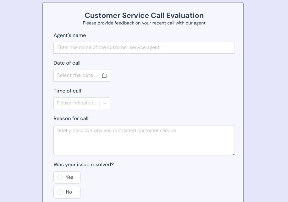 A call center feedback form is similar to a customer service form, but specifically tailored for phone-based interactions. This form measures call quality, hold times, agent knowledge, and first-call resolution. It's a critical tool for call center managers tracking team performance.