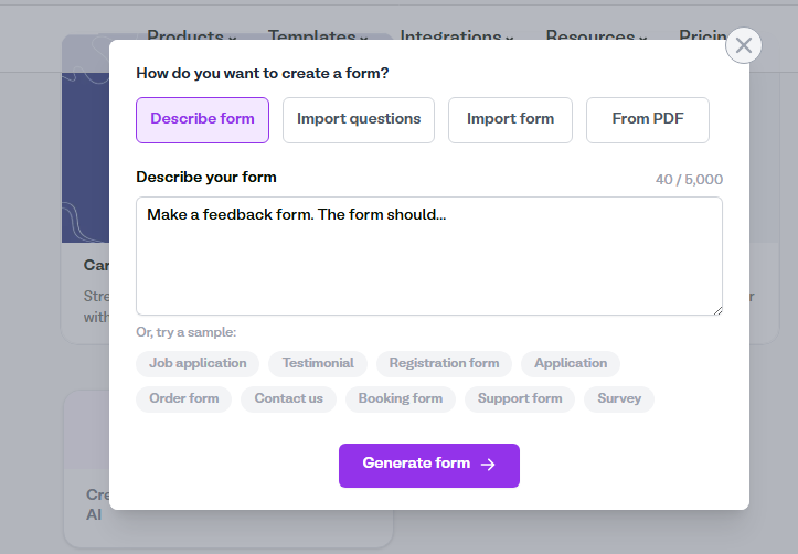 If you don’t find exactly what you need, you can generate a new template with AI in a few minutes. Describe your form, import questions, or create it from a PDF.