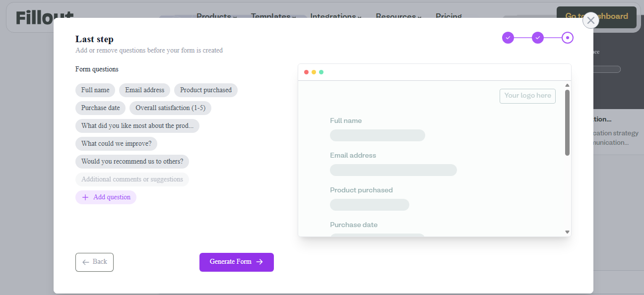 Then add or remove the suggested questions before Fillout generates the form.