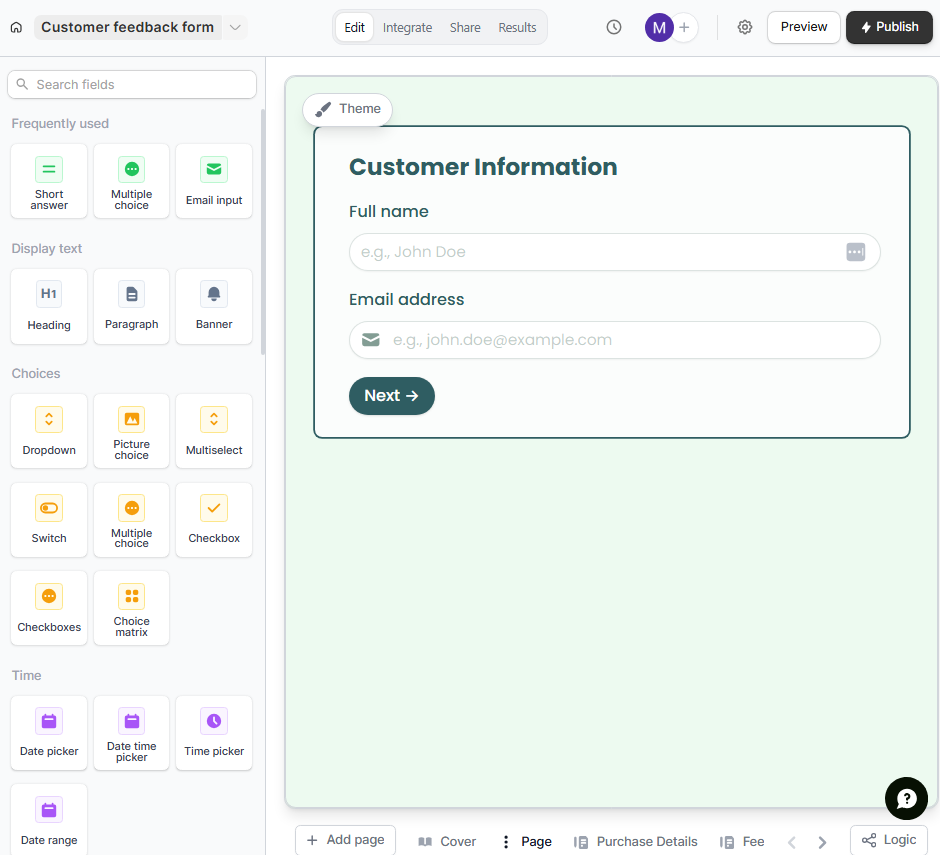 - Logic and conditions: Create dynamic feedback forms that adapt to form responses