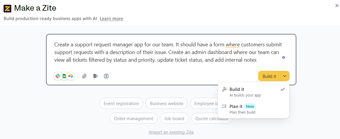 Pro tip: If you're building a complex app, use Plan Mode first. Click the settings icon and enable Plan Mode. Zite will ask clarifying questions and create an editable plan document before building. This prevents misunderstandings and wasted iterations.