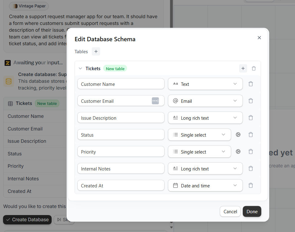 Review them, add any missing fields, and adjust names or types if needed. Then click Create Database.