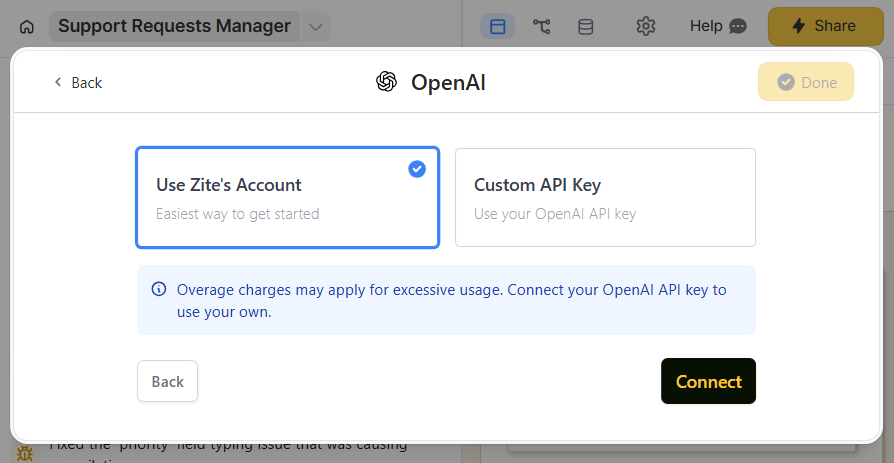 To use AI inside your app, you first need to connect OpenAI to your Zite workspace.