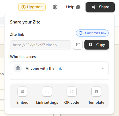 Click Share, then Publish to generate a live link. You'll get a shareable URL ( yourapp.zite.so), but you can personalize your app's URL with custom domains or subdomains.