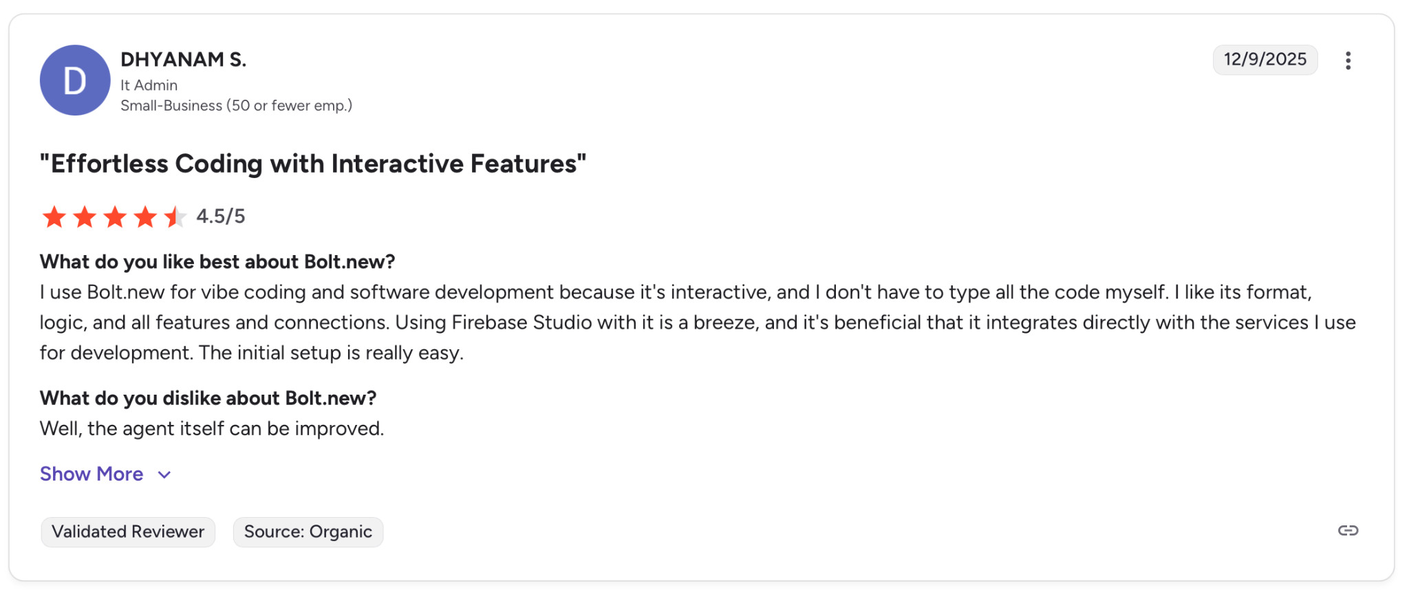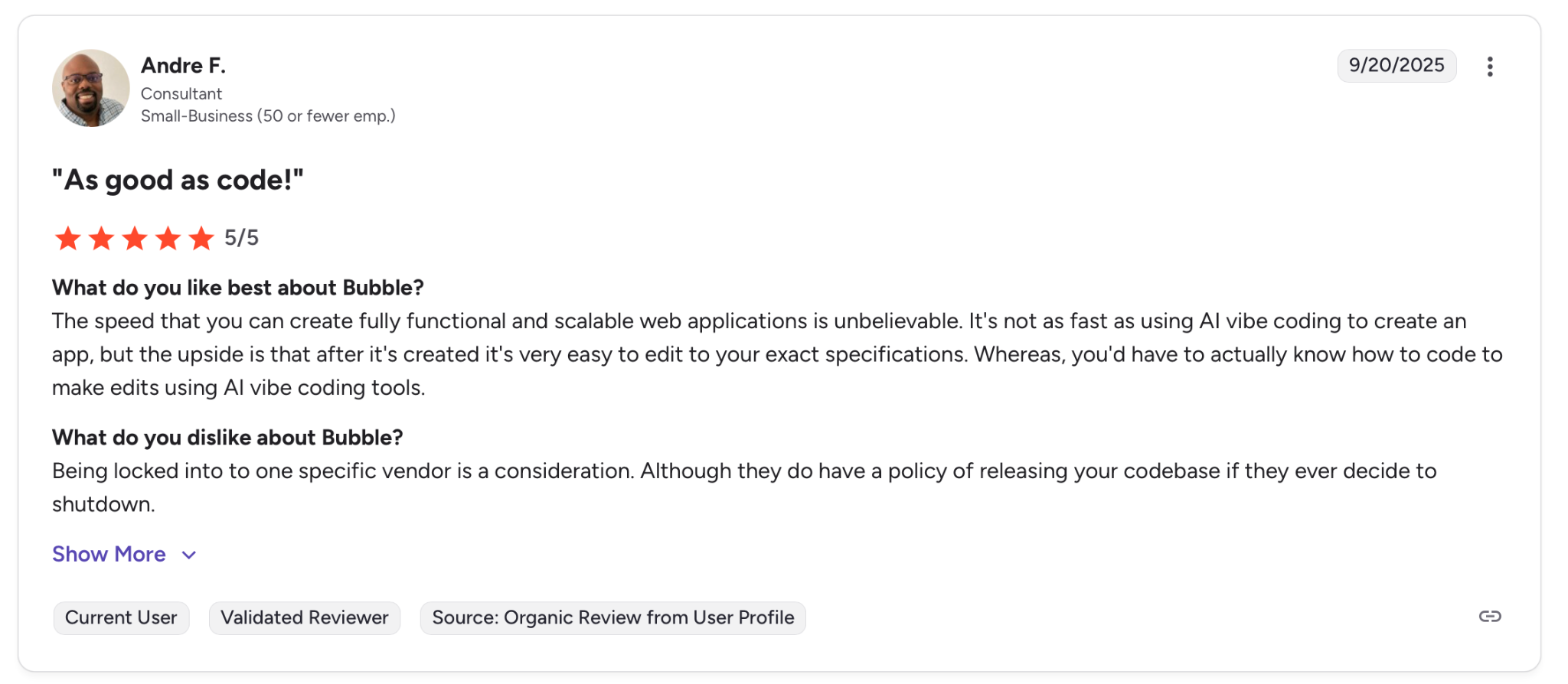 "Vibe coding is really amazing and it makes it super easy to develop an app for anything." — Kevin K. G2