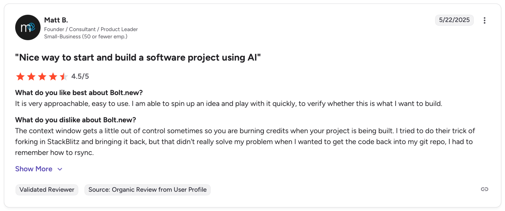 "The context window gets a little out of control sometimes so you are burning credits when your project is being built." — Matt B. G2