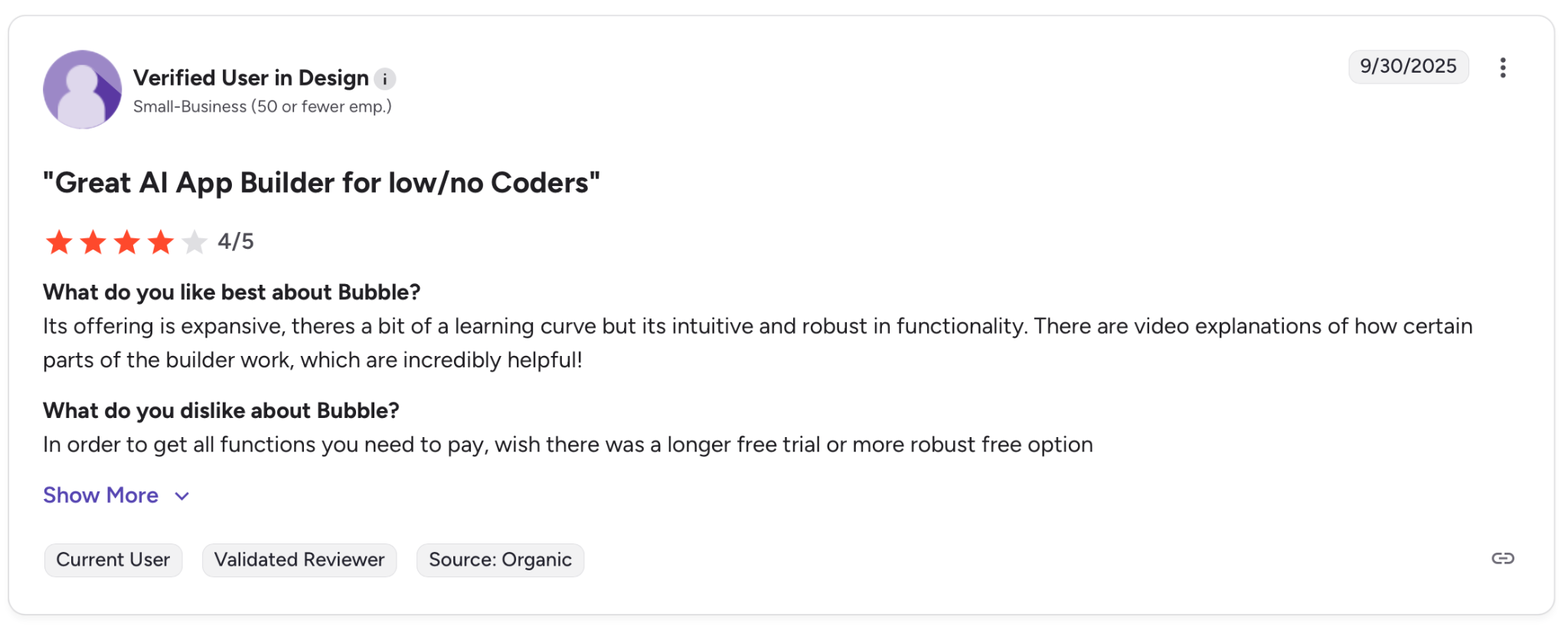 - Choose Bubble if you are willing to invest weeks learning the platform in exchange for full visual control over a production-grade SaaS app.