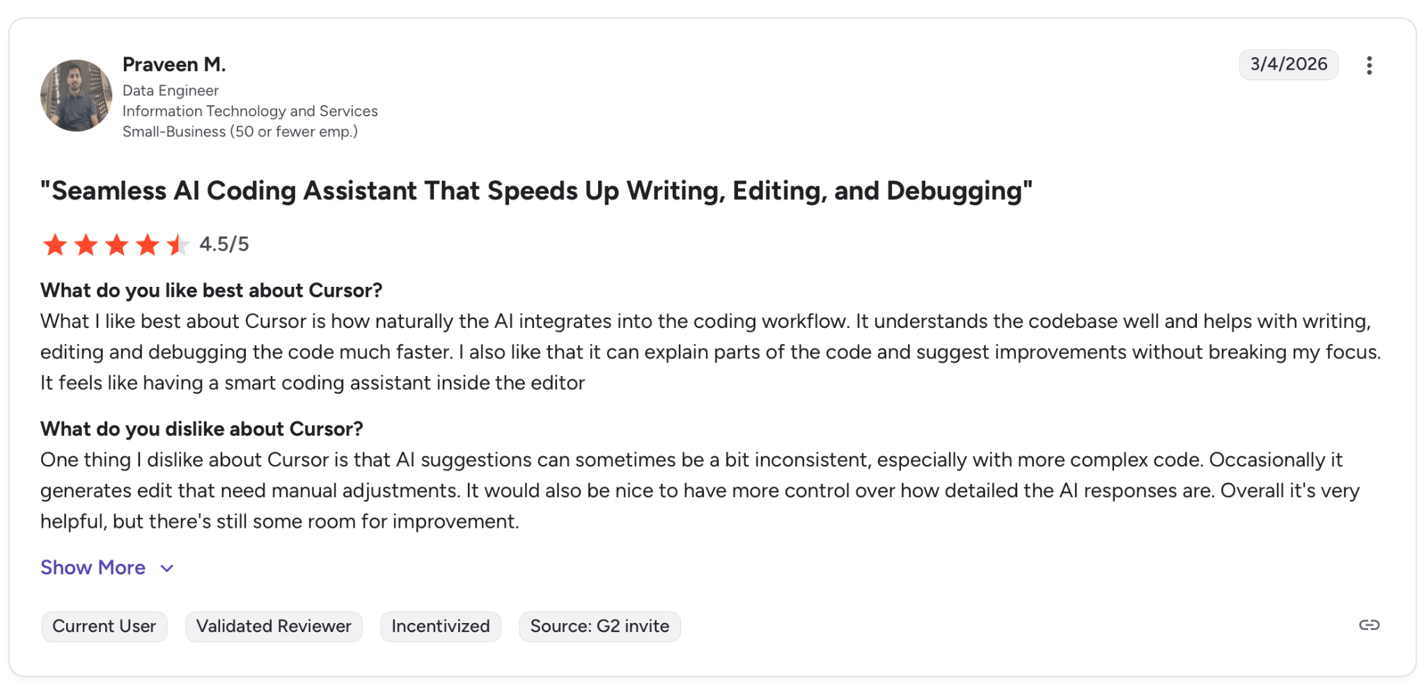 "What I like best about Cursor is how naturally the AI integrates into the coding workflow." — Praveem M., G2