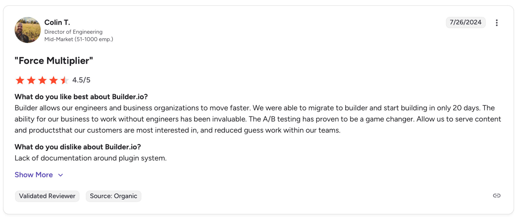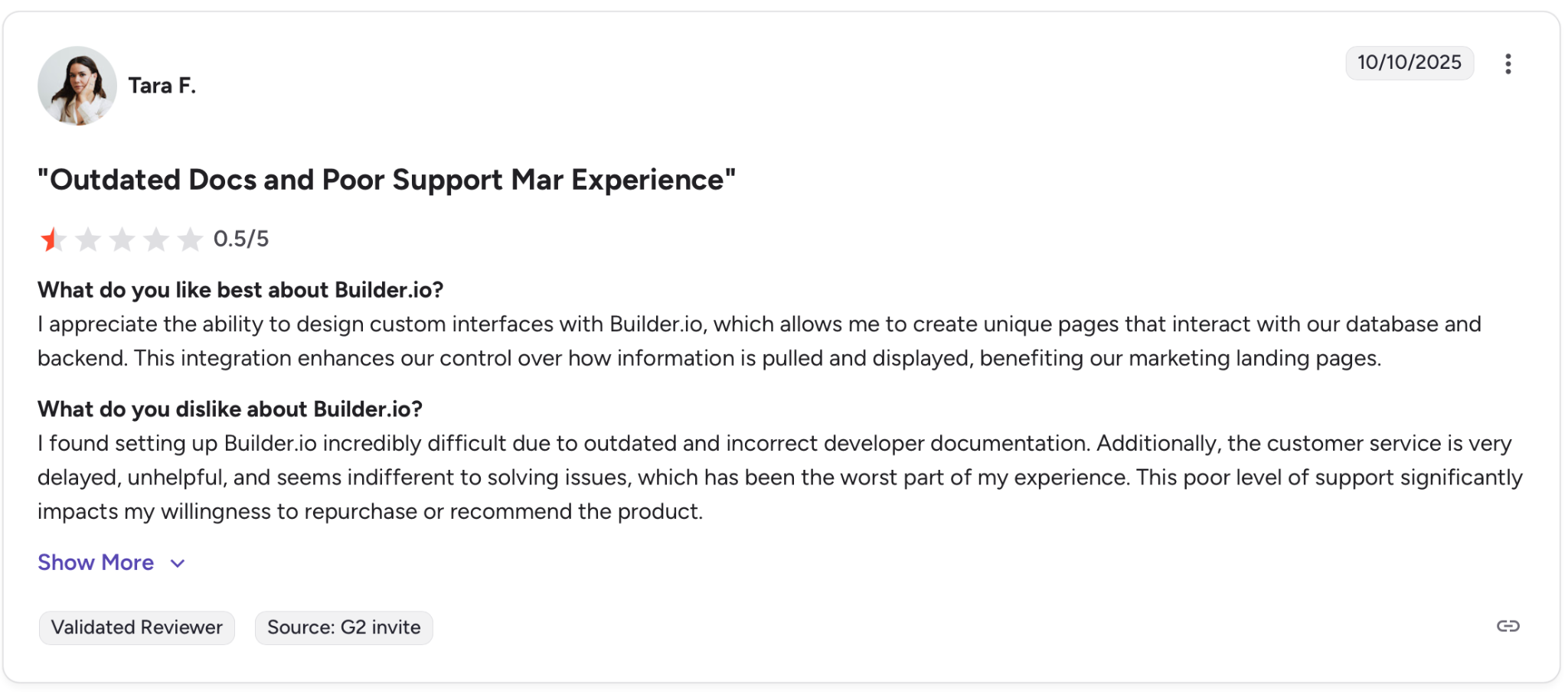 "I appreciate the ability to design custom interfaces with Builder.io, which allows me to create unique pages..." — Tara F. G2