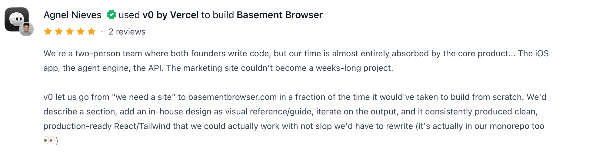 "v0 let us go from ‘we need a site’ to basementbrowser.com in a fraction of the time it would've taken to build from scratch." — Agnel Nieves, Product Hunt