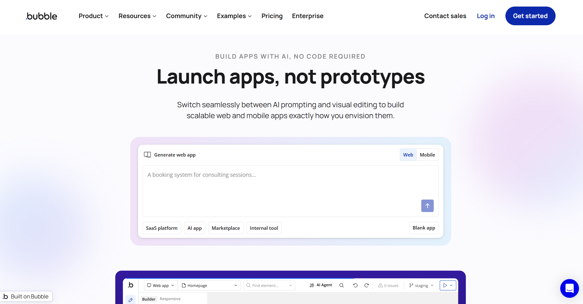 Bubble has been popular in the no-code space for over a decade. The platform recently added AI features to help generate pages and suggest workflows. However, it remains primarily a visual builder. You have to use the drag-and-drop builder to modify your apps after the first AI draft.