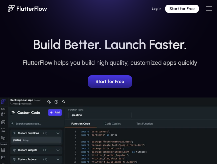 What it does: FlutterFlow is a visual builder for cross‑platform apps (iOS, Android, and web). It now includes AI features to generate screens, components, and even full apps from prompts or Figma designs.